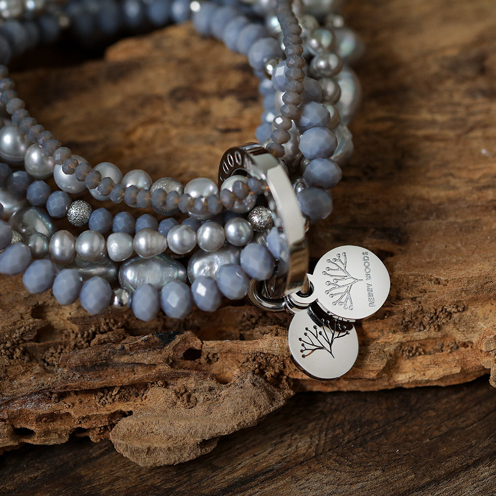 Armband mit echten grauen Süsswasserperlen und Edelstahl Ring sowie grauen Glaselementen.